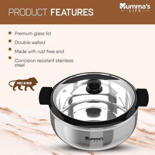 Mumma's LIFE Double Wall Belly Casserole with Steel Lid | Stainless Steel Solid Casserole | Hot Pot Stainless Steel Casserole with Steel Lid (Silver, 2100ML)